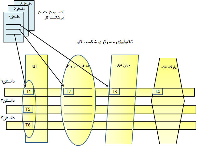 تعریف داستان ها می تواند برای اشخاصی که در روش فعالیت تکنیکی تجربه دارند، دشوار باشد. در توسعه ی نرم افزار، برای مثال، تیم ها ممکن است برای فعالیت هایی چون "بهبود واسط کاربر" یا "اجرای یک شمای پایگاه داده" استفاده شوند. این فعالیت ها، کاربرگرا نیستند. مثل "توانایی چک کردن نرخ اعتباری مشتری". شکل ذیل این دو دیدگاه را نشان می دهد: مشتری و تکنیک .این شکل یک معماری لایه ای فنی ویژه ی واسط کاربر، اشیای تجارت، میان افزار و پایگاه داده را نشان می دهد. برنامه های پروژه ی سنتی بر روی مناطق فعالیت تکنیکی تمرکز دارد. داستان ها به عبارت دیگر مشتری گرا هستند.