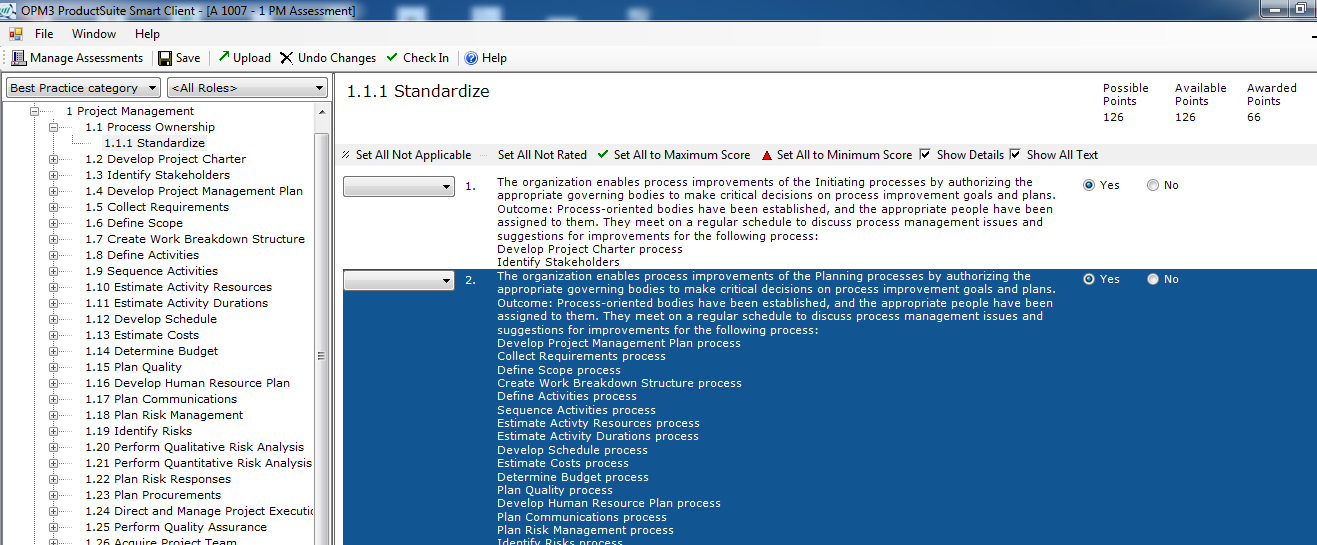 پس از وارد شدن به برنامه (شناسه کاربری و رمز عبور در دست مشاور و ارزیاب رسمی PMI می باشد ) ،2 بخش اصلی و 2 بخش فرعی وجود دارد .کاربر جهت تغییرات مشخصات کاربری خود می تواند منو User profile را انتخاب نماید .منو دیگر مربوط به مشخصات سازمانها جهت ارزیابی می باشد .این مشخصات شامل :نام سازمان ، صنعت سازمان ،گردش مالی، تعریف دپارتمانها و مشخص نمودن دامنه ارزیابی ،مشخص نمودن نوع ارزیابی و غیره می باشد .از منو های اصلی می توان به ابزار ارزیابی (Assessment Tool) اشاره نمود .