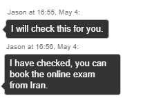 اما برای اطمینان بیشتر در تاریخ چهارم می 2020 در ساعت 16:30 ( پانزدهم اردیبهشت ماه سال جاری) به وقت ایران مجدد با PMI و مرکز برگزار کننده آزمون( پیرسون pearson vue ) تماس حاصل گردید که نتیجه آن در ذیل قابل رویت می باشد.