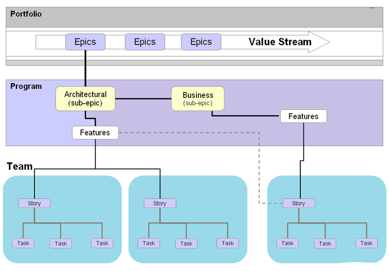 تصویر ذیل نشان می دهد که چگونه فرآیندهای اجایل کار می کنند.اپیکس (Epics) بخش بزرگ کار است که بعدا به بخش های کوچیکتر مانند زیر اپیکس (Sub-Epicts) و داستان ها (Stories) شکسته می شود.این زیراپیکس ها به تیم ها به عنوان یک داستان تخصیص داده می شود.سپس هر تیم بر روی این داستانها و یا قابلیتهای نرم افزار کار می کنند.