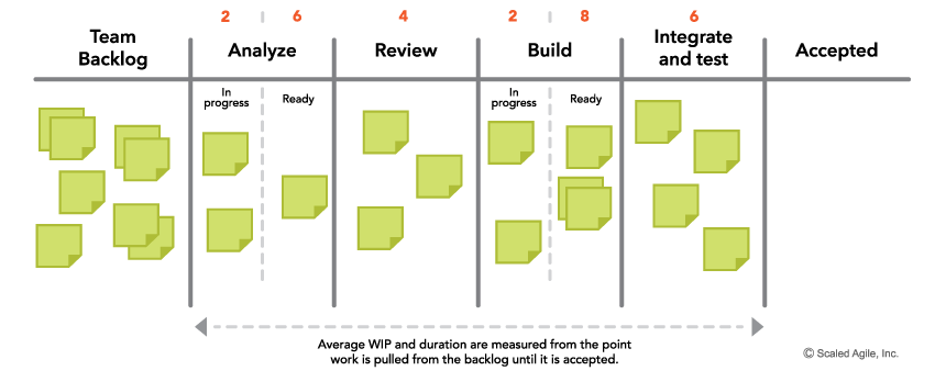 برای بهینه سازی جریان، تیمها با استفاده از سیستم کانبان، پیشرفت کارهایشان را مدیریت میکنند. تخته کانبان جهت بهبود جریان و محدود کردن کار در محل اجرا، در شناساندن تنگناها به تیمها، کمک میکند تا تیمها قبل از شروع موضوعات جدید، از اتمام کار مطلع گردند. در شکل ذیل. مثالی آورده شده است.